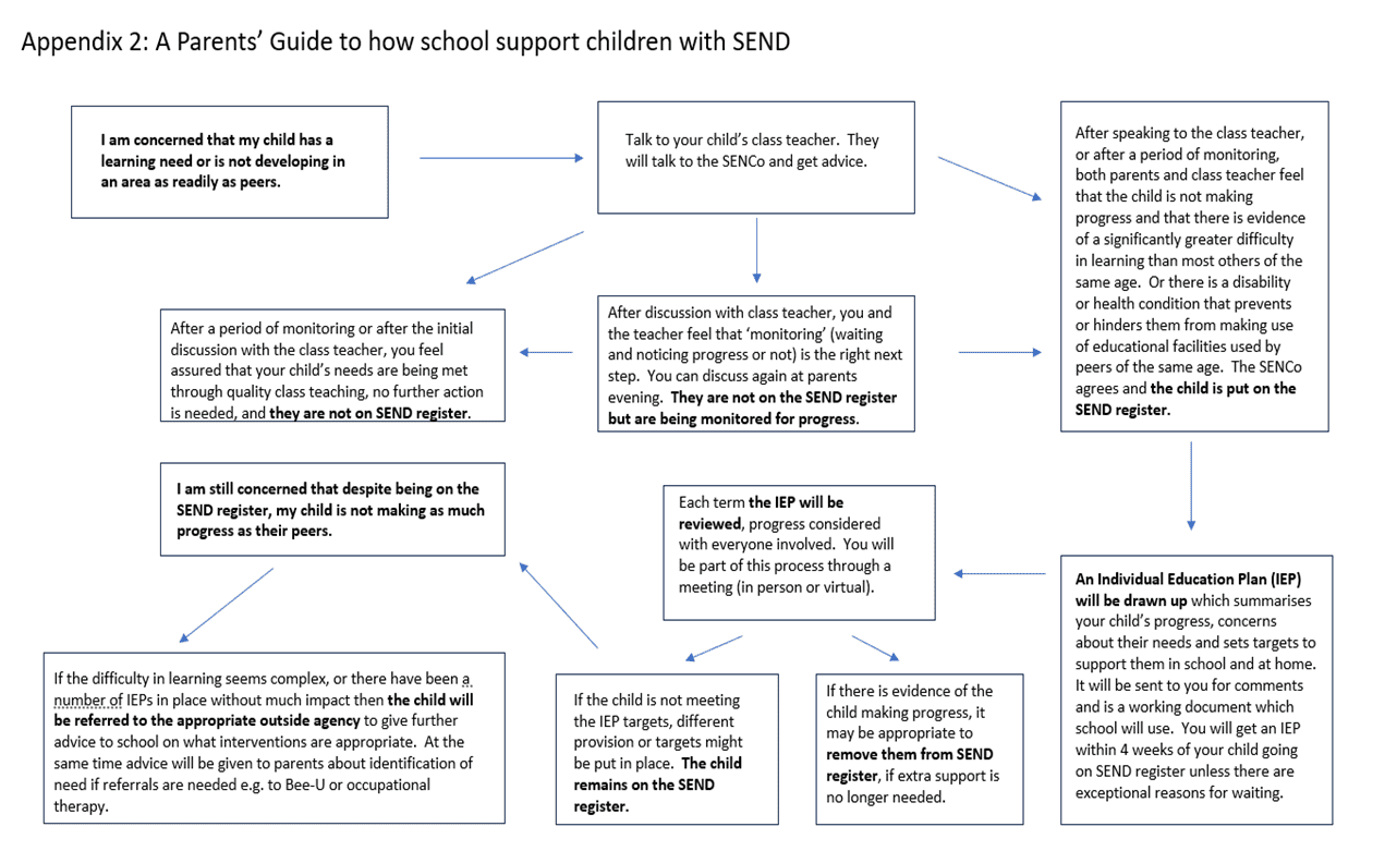 We are committed to ensuring that all children at our school are happy, enjoy school, can take part in all our learning and activities and are making progress. Some children may need additional support at school because they have a special educational need or disability (commonly referred to as SEND).